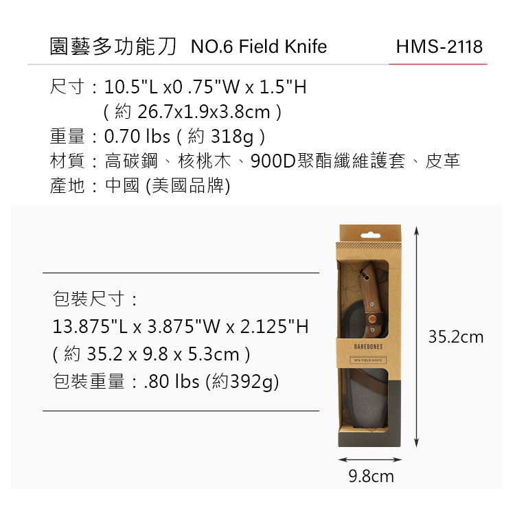 材質:高碳鋼、核桃木、900D聚酯纖維護套、皮革