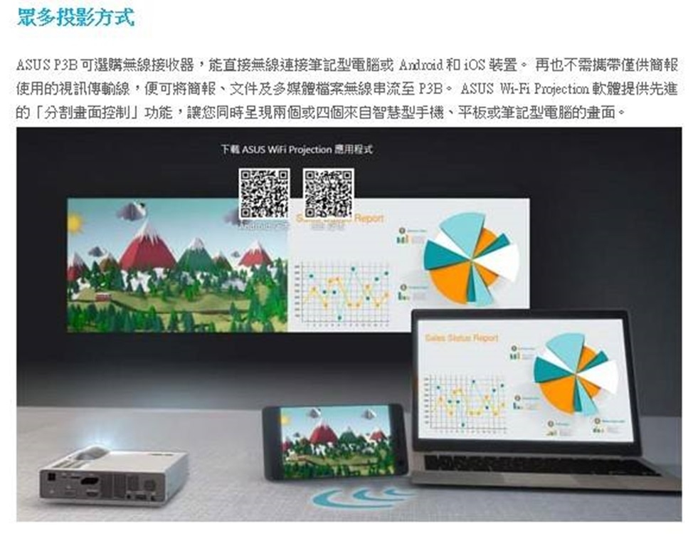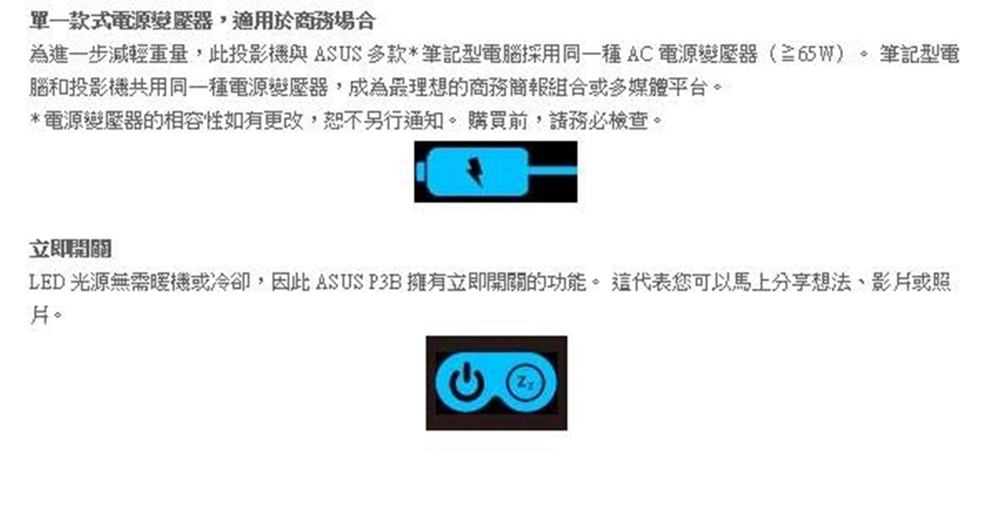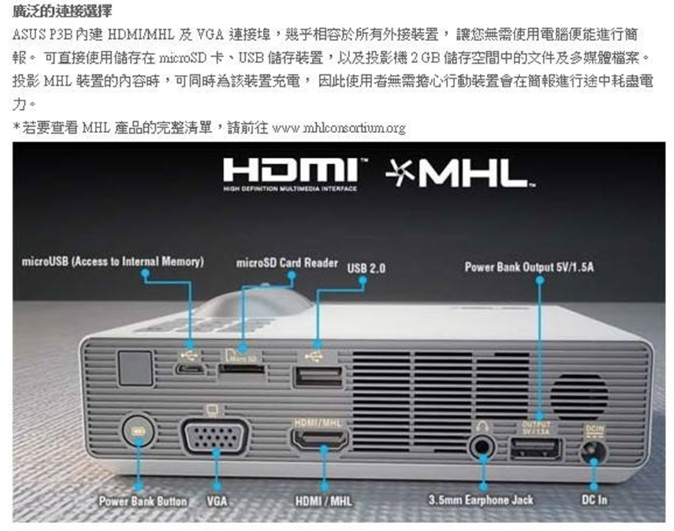 華碩推出全新P3B可攜式行動電源LED投影機,機身輕巧僅750公克,可輕鬆放入公事包、手提袋;內建無汞Eco-LED燈源,具備長達3萬小時使用壽命,以及超高800流明度與100% NTSC寬廣色域,為市售最亮內建電池投影機,可精彩呈現明亮出色的投影效果;再搭配超短焦鏡頭,不僅可提供1280 x 800 (WXGA)高清解析度影像,還能進行0.45公尺至3.4公尺近距離投影,使用者得將任何平坦表面做為投影幕使用,同時最高投影出200吋大畫面,遙遙領先同級產品;無論是在有限空間中做商務簡報,或戶外休閒影音分享皆能隨心所欲;此外,兼具工藝美學與傑出性能的P3B可攜式行動電源LED投影機,亦榮獲2015年Good Design設計大賞殊榮肯定!而為提供使用者更無懈可擊的視聽覺感官享受,P3B可攜式行動電源LED投影機,配備「自動梯形修正」功能,可自動偵測投影機位置,修正因投影角度所造成的失真影像;再加上兩段式調整腳架設計,可快速、直覺調整投影機高度,全方位提升成像品質;透過內建華碩獨家SonicMaster聲籟技術,還可傳遞最無與倫比的高傳真音訊,同時與生動細緻的畫面完美結合,織就出令人無限驚豔的娛樂饗宴。極致續航力 精彩不間斷P3B可攜式行動電源LED投影機,內建可充電式鋰電池,充電一次可持續使用達三小時,並可做為12,000mAh行動電源使用,即使是關機狀態,也能持續為手機、平板等行動裝置持續充電;同時還具備「立即開機/關機」功能,使用者無需等待LED燈源暖機或冷卻,即可享有更體貼入心的操作體驗;此外,P3B可攜式行動電源LED投影機,亦可共用大部份華碩筆記型電腦專用之交流電電源變壓器(≧65W),減輕使用者外出時攜帶負擔,化身工作、娛樂絕佳良伴。豐富連線力運用更多元使用者選配無線接收器,即可不透過任何連接纜線,將P3B可攜式行動電源LED投影機與個人筆記型電腦或Android / iOS等行動裝置進行配對,並同步串流裝置中簡報、文件及多媒體檔案;全新P3B可攜式行動電源LED投影機,除內建2GB儲存容量,還配備HDMI / MHL / VGA / Micro SD / USB等豐富連接埠,可支援多樣化投影來源,使用者就算不攜帶電腦也能進行簡報及分享;更重要的是,投影時還可為支援MHL功能的智慧型手機、平板進行充電,無需擔心行動裝置沒電而中斷!