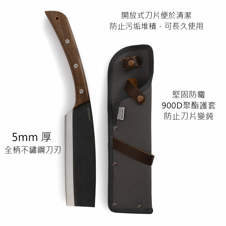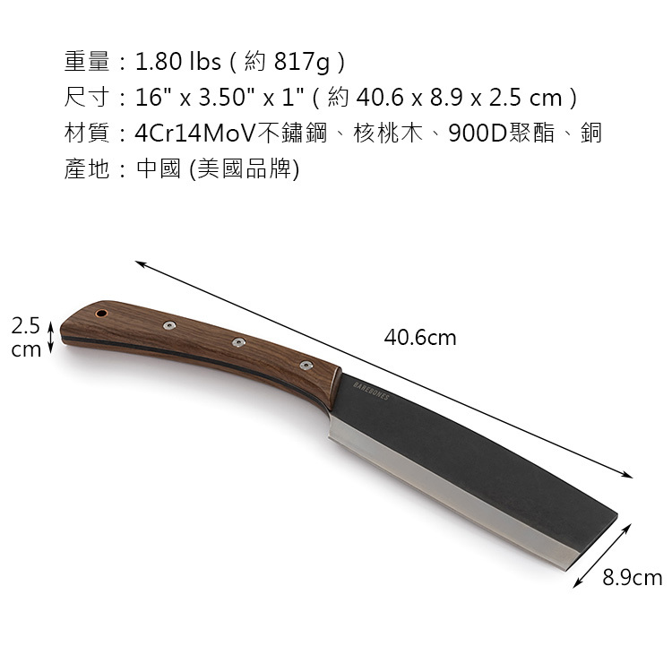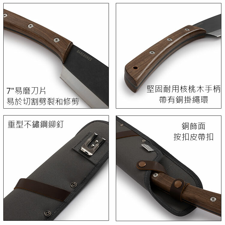 • 堅固耐用的核桃木手柄,帶有銅掛繩環
