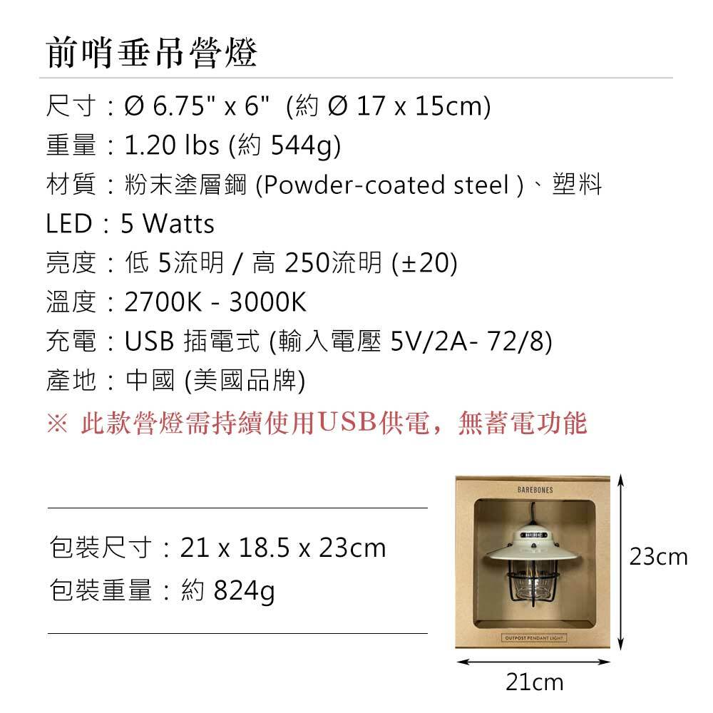 | 內容物: | BarebonesOutpost Pendant Ligh前哨垂吊營燈x1;USB插電線x1 |